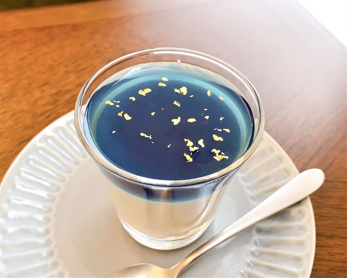 デザートも充実しています。こちらは数量限定の「夜空のレアチーズケーキ」1000円。透明感のある藍色のゼリーには金箔がのり、こちらもクリームソーダに負けず劣らずの美しさ…!なめらかな食感とほんのりとした甘みのレアチーズは、コクがありながらもさっぱりとした味わい。なかには砕いたクッキーが入っており、異なった食感も楽しめます。