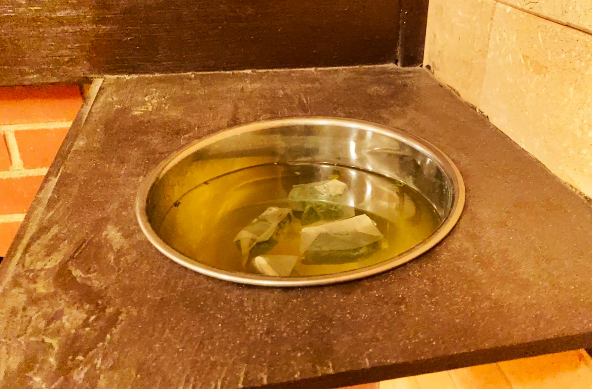 まるでお茶の香りに優しく包まれているような感覚です。不思議と一般的なアロマ水を使ったロウリュよりも長く入っていられそうな気がしました。※個人の感想です。