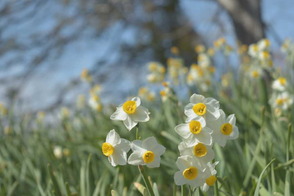 この写真では一番手前のスイセンだけを主役にしたいので、数センチしか離れていないすぐ後ろの葉から、奥の存在感のある木まで、ボケるように設定しています。