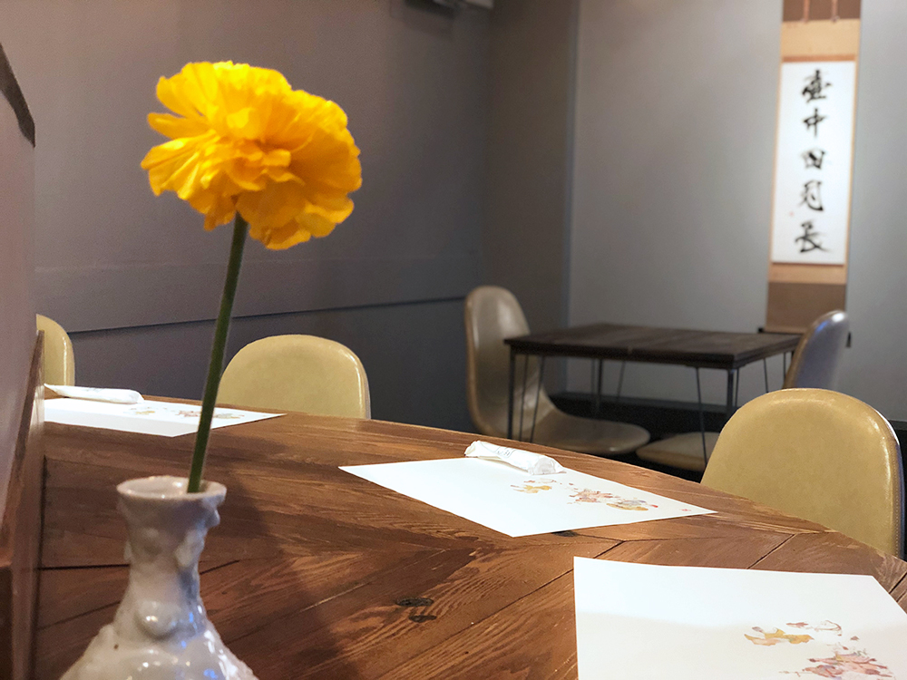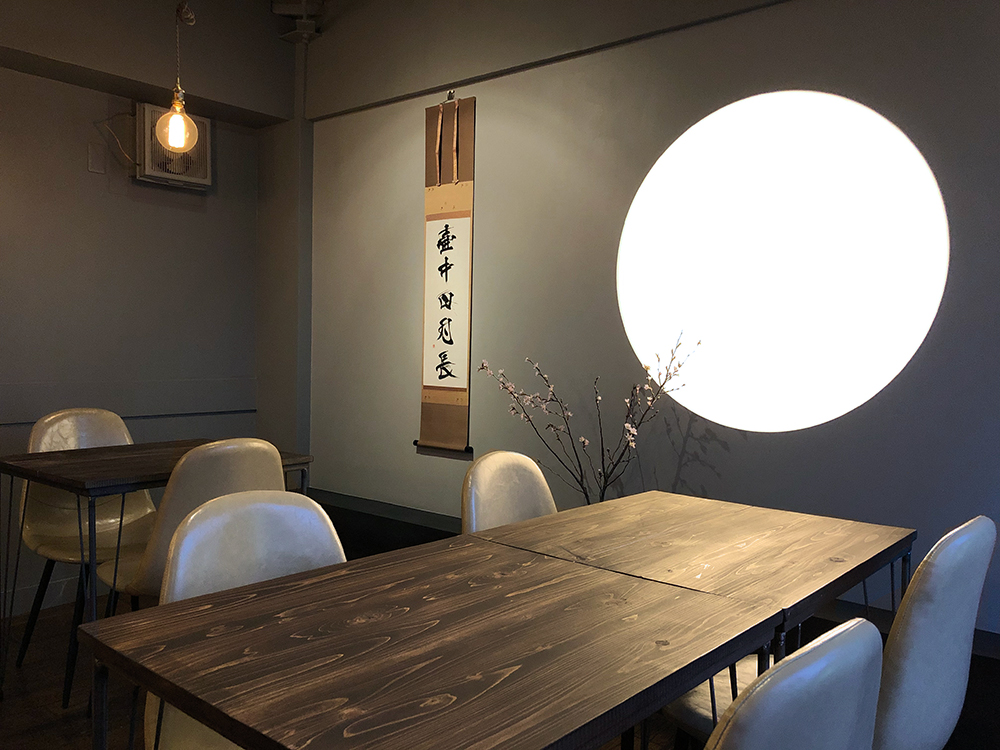 木目を基調としたシンプルでモダンな店内には、掛け軸や生け花、間接照明など和テイストのアクセントが効いていて、居心地のいい雰囲気。特に夜の時間は、忙しい日々の喧騒を忘れて静かにゆっくりと過ごせます。