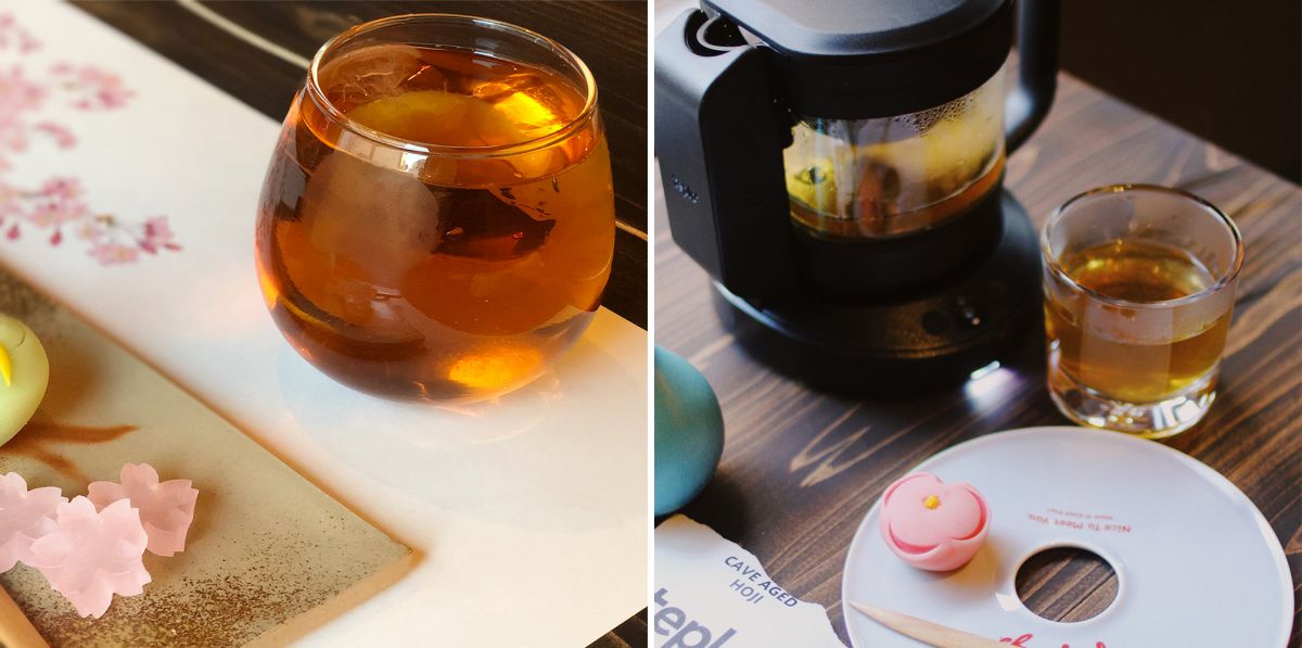 この日いただいた「ほうじ茶ウイスキー(写真左)」は、スモーキーな香りが鼻に抜ける深みのある一杯。はじめての組み合わせにおそるおそる口にしてみましたが、お菓子の甘みとカクテルの渋さのバランスが絶妙でクセになるおいしさでした♪