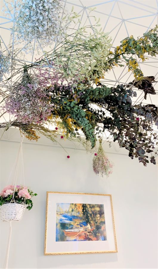また天井に飾られたドライフラワーは、コロナ禍で各地のイベントが中止になったことで使われなくなった花を買い取り、作られたもの。このような優しさが、お店の空間にもあふれ、とても居心地のよいお店を作り出しています。