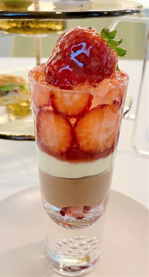 この日、特に目を引いたのは「ヴェリーヌ」。いちごにはバラのジュレがかかり、いちごとバラの風味が漂います。その下には抹茶のムースと、チョコのムースが層を成しており、酸味から甘味のグラデーションを味わえる一品なのです!