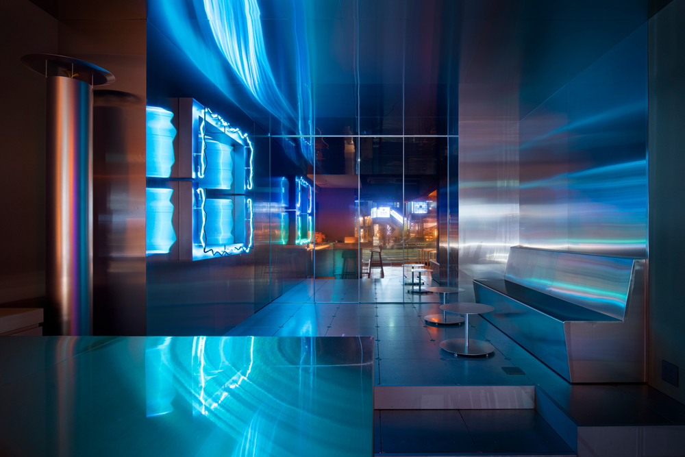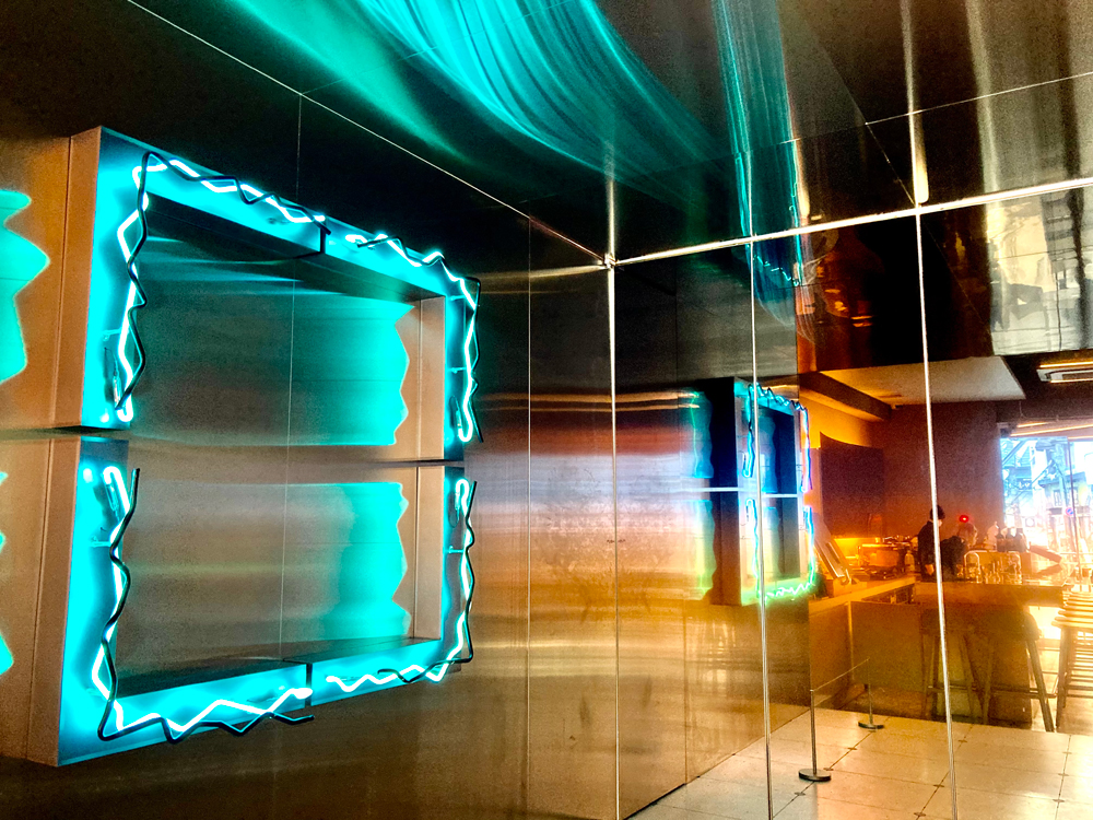 内装もかなりスペーシー。頭上から降り注ぐ音や、柔らかな光、ネオン、モニュメントアートなどが六本木の喧騒から異空間へと誘ってくれます。