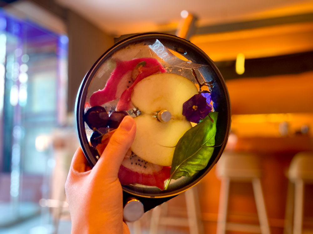0%のシグネチャーカクテル「A Real Pleasure〜ゼロ(0)になる〜」はベチバーウォーター、りんごやレモンと日替わりのフルーツ、バジルをボトルに詰めています。