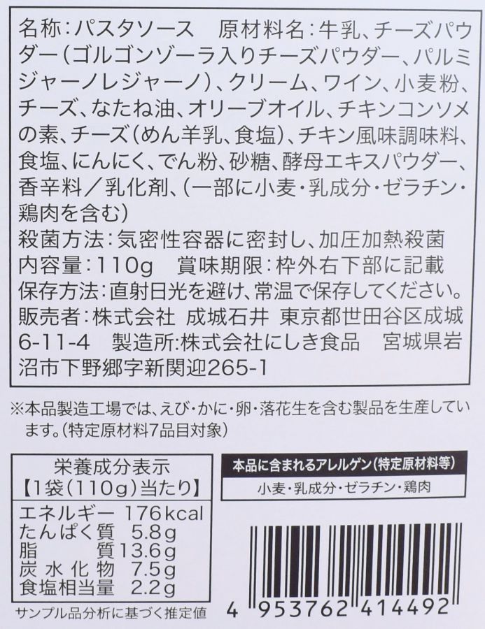 成城石井のパスタソースのなかでもトップクラスの売れ行きを誇る「ゴルゴンゾーラ香る 濃厚クアトロフォルマッジ」323円。こちらは『マツコ&有吉 かりそめ天国』の“ガチガチランキング パスタソース編”で2位に輝き、SNS上でも話題となった商品です。