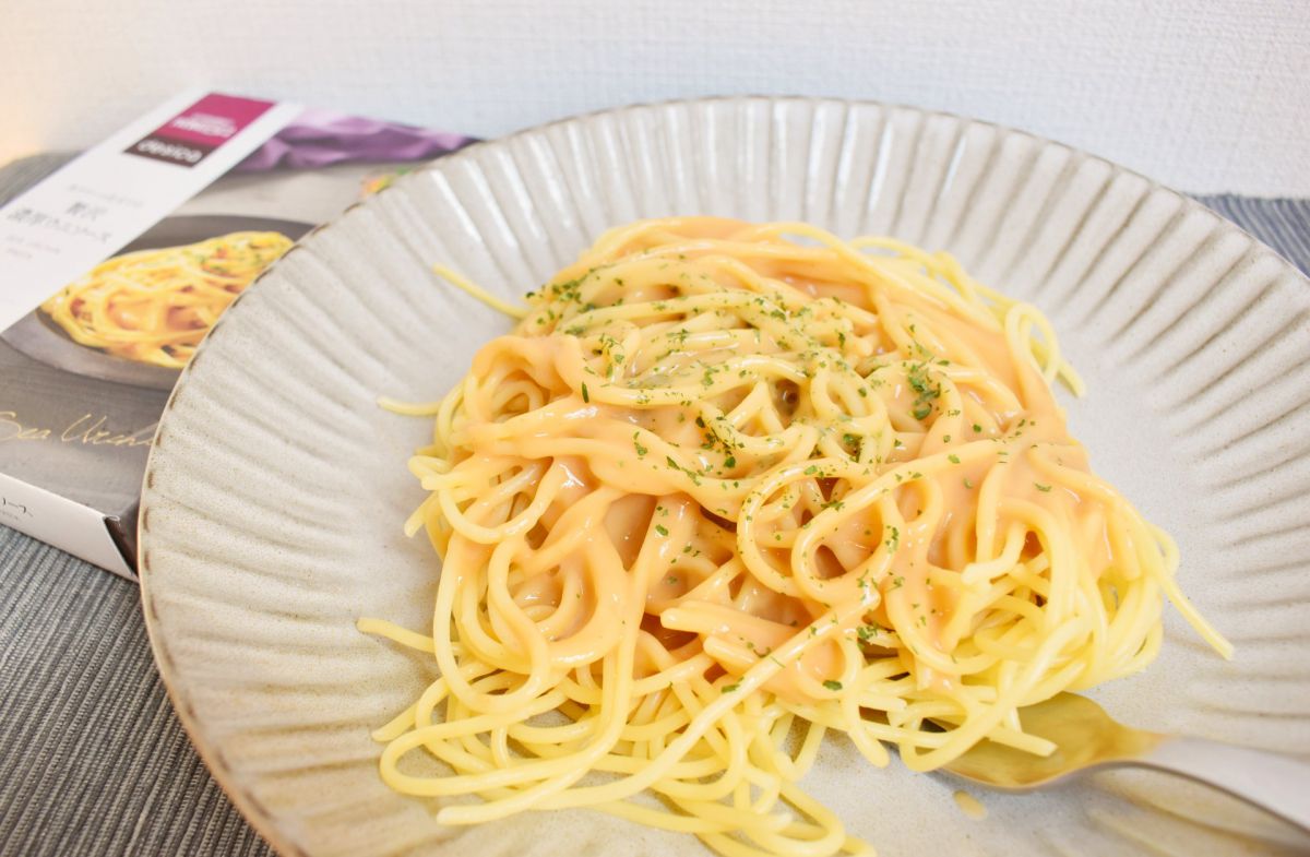 魚醤やアンチョビソースなども使われているためか、パウチを切った瞬間から磯の香りがふわり。一口食べると、生クリームのまろやかさと、旨みの強いパルミジャーノ・レジャーノ、ウニの風味が絶妙に絡み合って、なんとも贅沢な味わい!