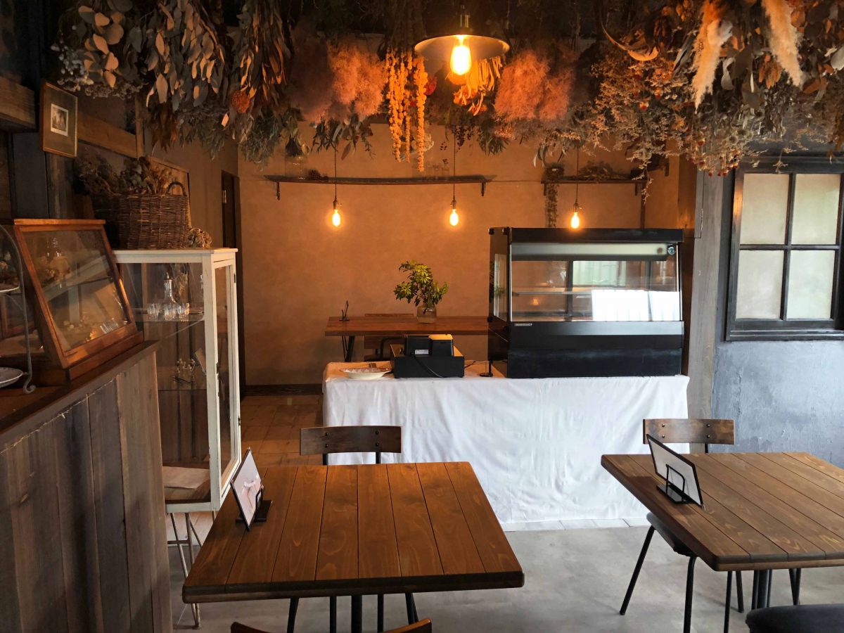 中に入ると、まるで外国にあるような趣のあるカフェ。天井からつるされたドライフラワーが作り出す、優しく味のある雰囲気がとっても素敵!