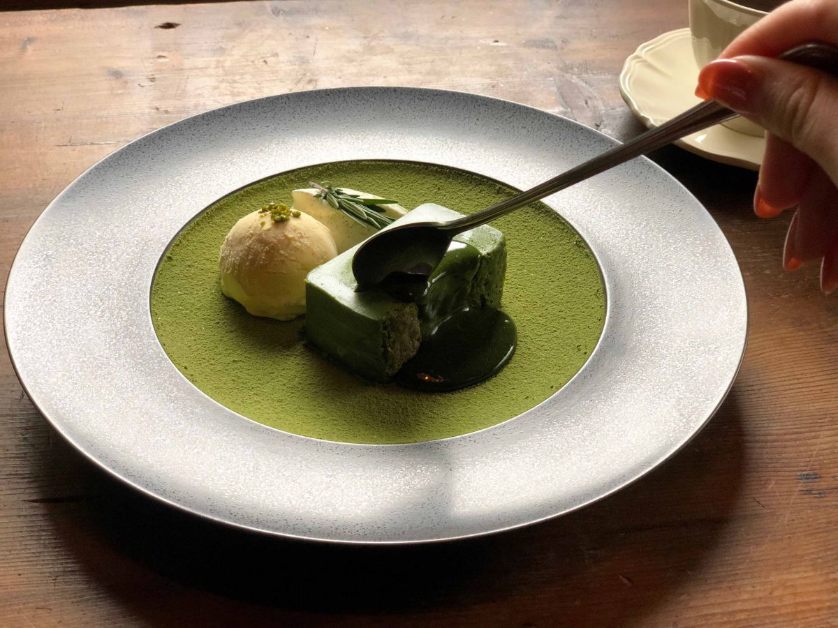 まずいただいたのは、思わず見とれてしまう「抹茶テリーヌ」。食べるのがもったいないほど美しいビジュアル…!
