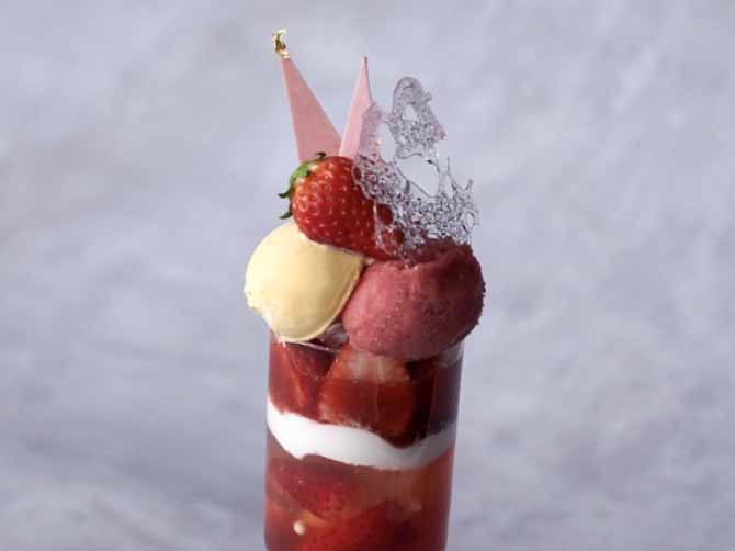 続いては、旬のいちごを使った豪華な「イチゴのパフェ」。見ているだけで圧倒される、まるで芸術作品のような見た目に心を奪われます。