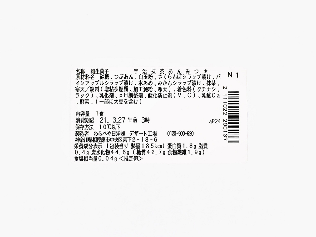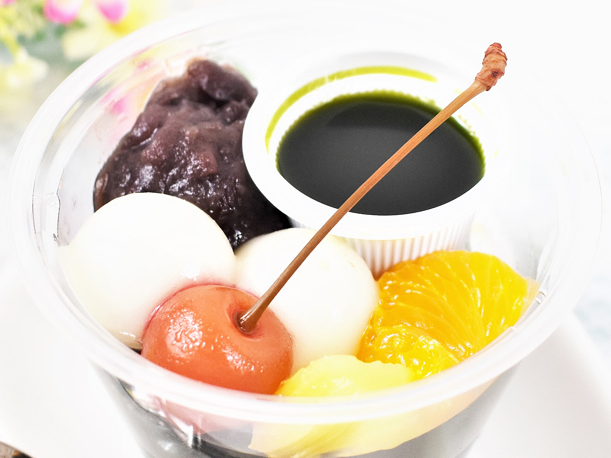 彩り豊かなトッピングが目を引く「伊藤久右衛門監修 宇治抹茶あんみつ」。カップに詰められた抹茶ゼリーの上に白玉や粒あん、さくらんぼ、みかん、パインが盛りつけられています。