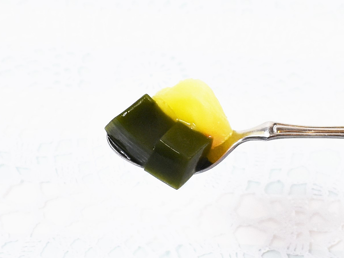 まずは抹茶ゼリーをチェック。みずみずしいゼリーを食べた瞬間、爽やかなお茶の香りがふわっと口の中に広がりました。予想以上に濃厚さが引き立つ味わいには正直びっくり。ゼリーにしてはあまり水っぽさを感じないあたり、さすがは宇治抹茶といったところでしょうか。