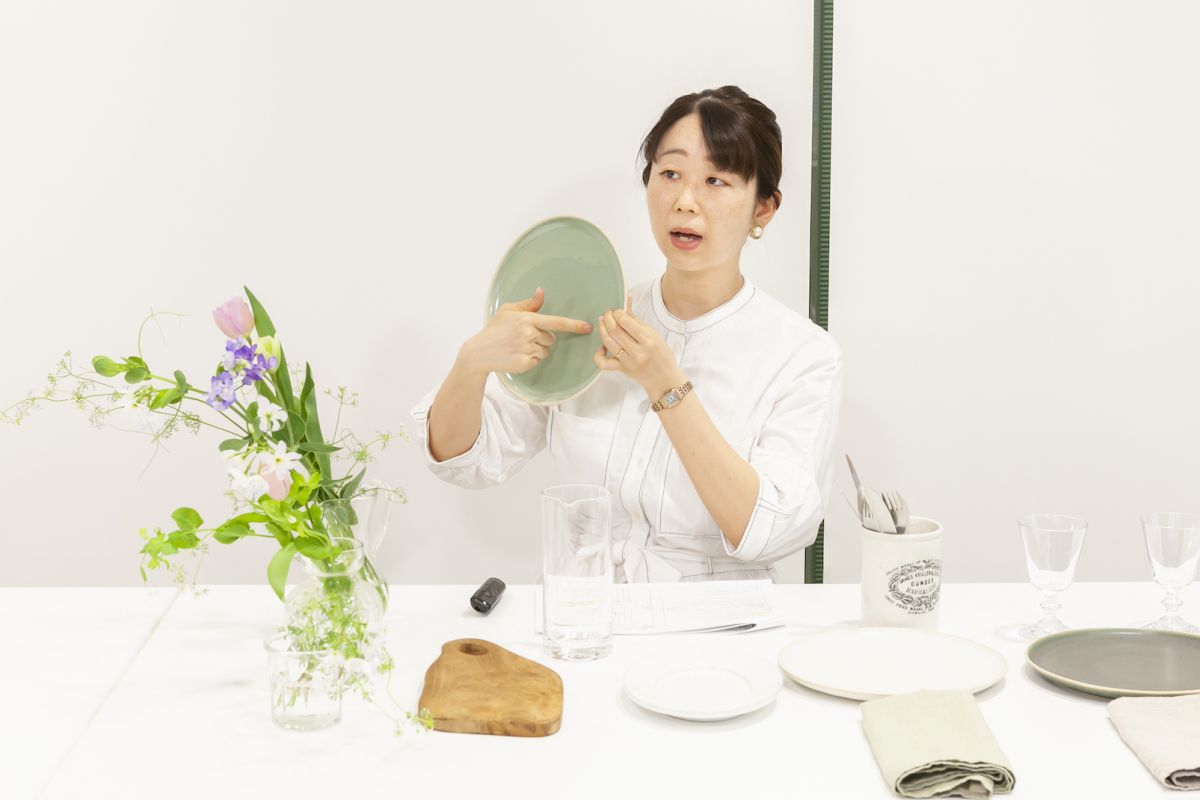 この日は、淡いグリーンのほか、同じシリーズからニュアンスのあるアイボリーと濃いグレーのお皿も登場。前者はグリーンと同じ効果が狙え、後者は色の白い食材を引き立たせ、濃い色の食材をリッチに見せてくれます。