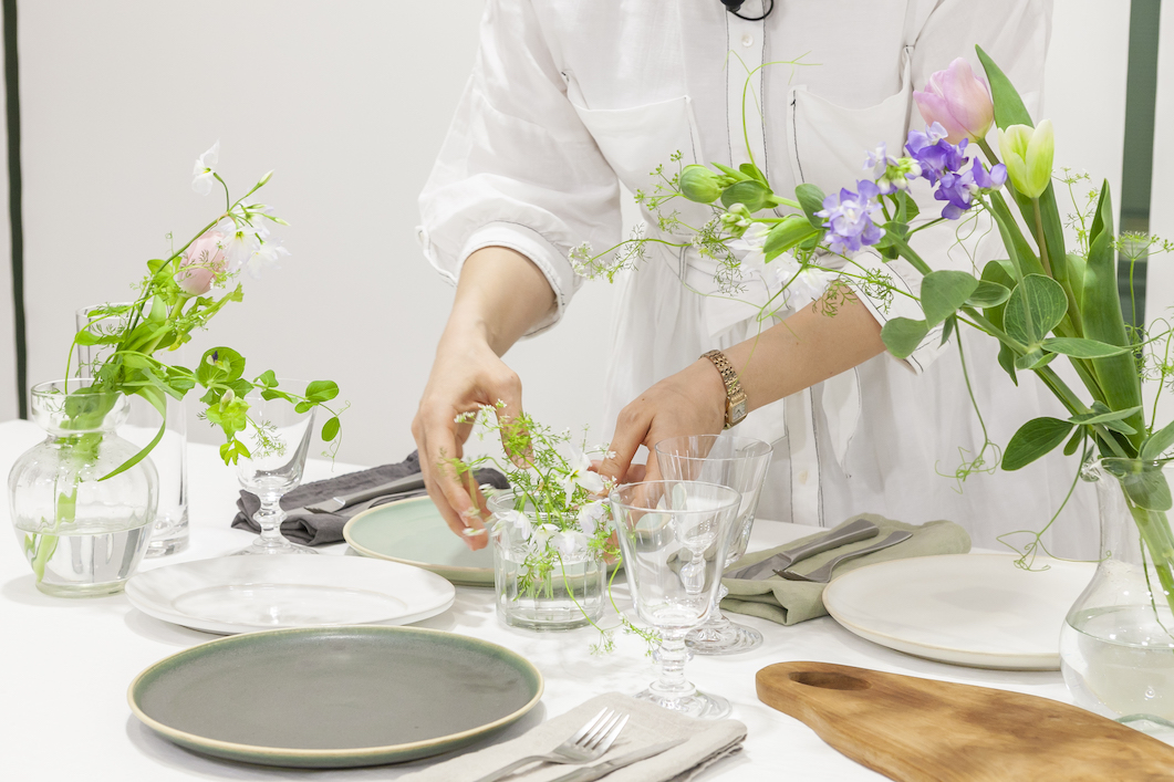 春から夏に向けてぴったりなハーブウォーターを入れるカラフェや、季節の植物や花を飾る花瓶やグラスも背の高いもの、低いもの両方取り入れて高低差を演出すると、より素敵なテーブルになるそう!