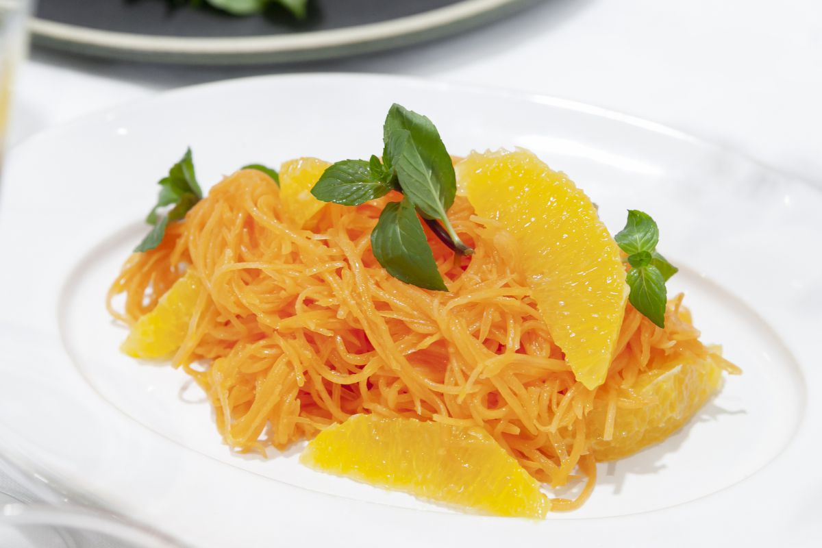 キャロットラペの盛りつけアレンジとしてフルーツを加え、ミントを飾ってさらに彩り豊かになりました。