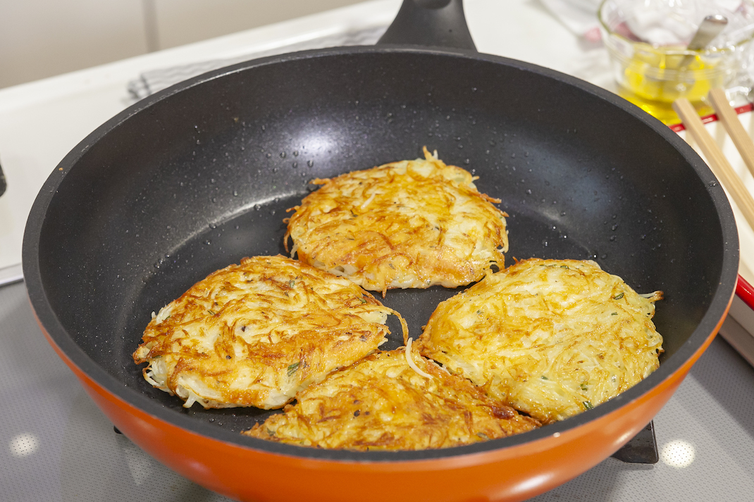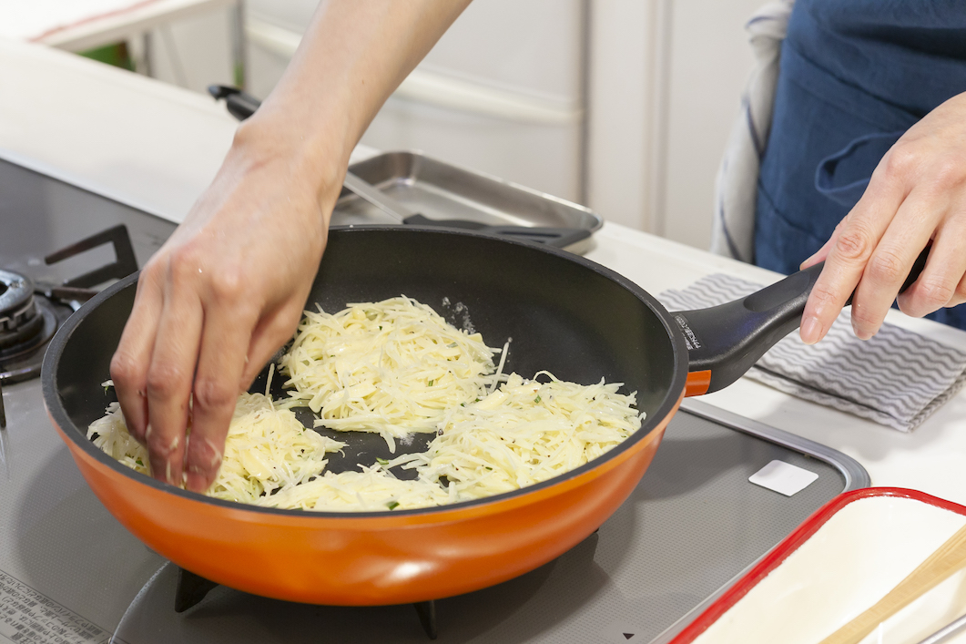 SHINOBUさん「続いては、じゃがいものガレットです。ガレットは丸く焼いたお料理という意味で、よくそば粉を焼いたものをガレットと呼びますが、今日はじゃがいもで作ります」