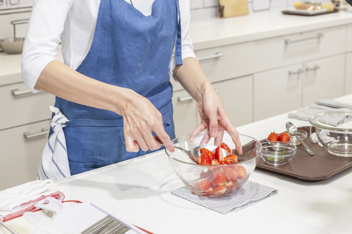 SHINOBUさん「今が旬のいちごはそのまま食べても美味しいですが、少し時間をかけてオシャレなメニューにしてみましょう。今回は益子焼に合わせて栃木の<とちおとめ>を用意しました!」