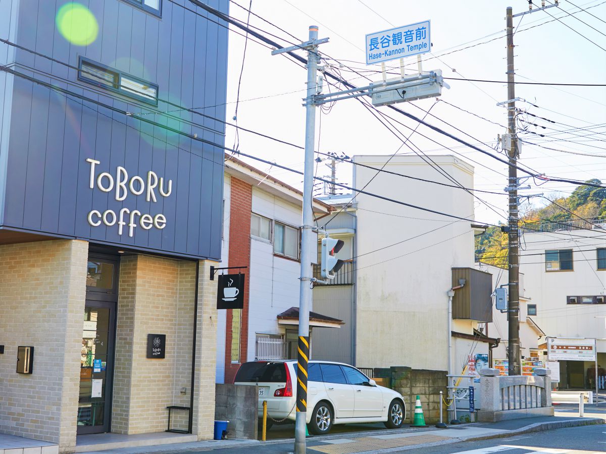 江ノ電・長谷駅から歩くこと約3分。「長谷観音前」交差点の目と鼻の先にあるこちらの建物が、今回の目的地「ToBoRu Coffee(トボルコーヒー)」です。