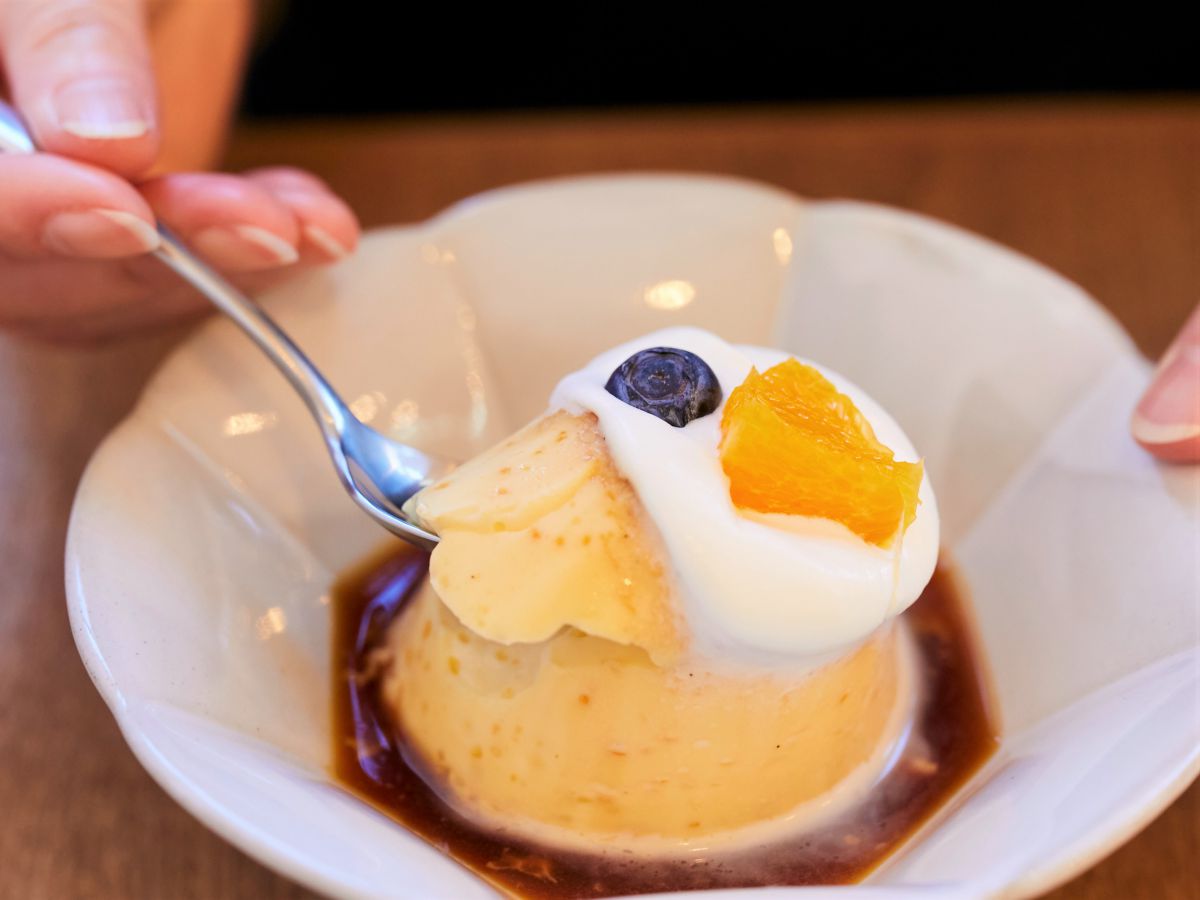 プリンにトッピングされるフルーツは月替わり。取材時はブルーベリーとネーブルオレンジでしたが、イチゴやサクランボなども登場するそうですよ。