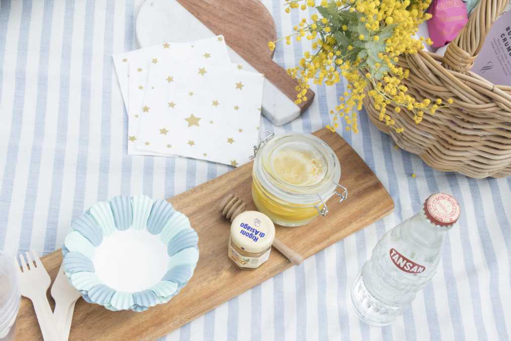 お皿やナプキンなどカラフルな紙雑貨をプラスするだけで、シートの上が賑やかに。カッティングボードもお手頃価格のものが増えてきています。フードを自由に並べられるので、ぜひ取り入れたいアイテム。
