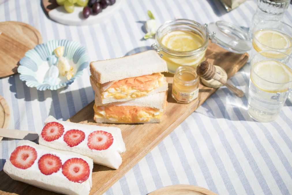 外で食べるごはんは普段よりずっとおいしく感じられて不思議。フォトジェニックなピクニックを目指すなら、メインは断面がカラフルなサンドイッチがおすすめです。自分で作っても買ってきてもOK。ピクニックに面倒なルールはありません。