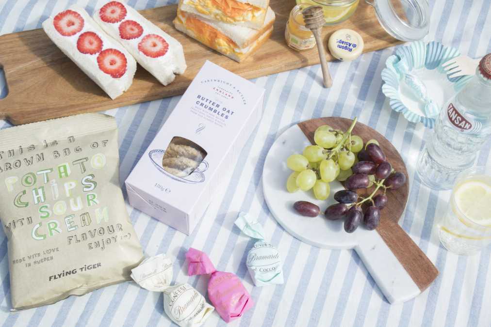 パッケージのかわいいお菓子は、楽ちんピクニックのマストアイテム。シートに並べるだけで気分があがります。ブドウやイチゴなどのフルーツもあればもっと華やかに。