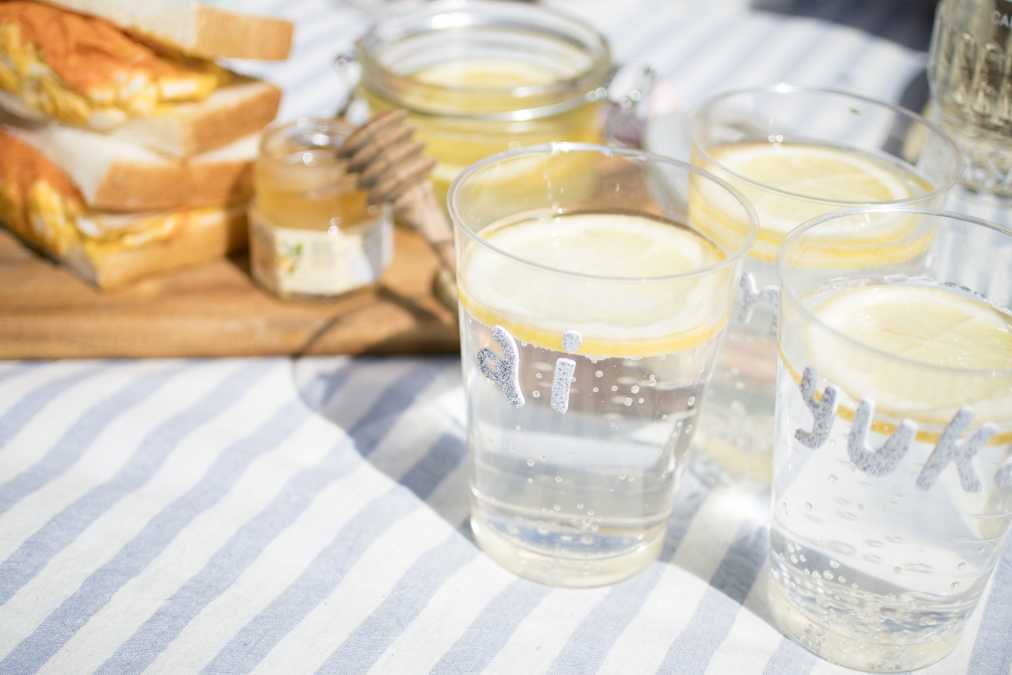 スライスレモンとはちみつで手作りレモネード。春にぴったりの爽やかなドリンクです。ソーダはちょっとレトロな瓶のものを選んでみました。