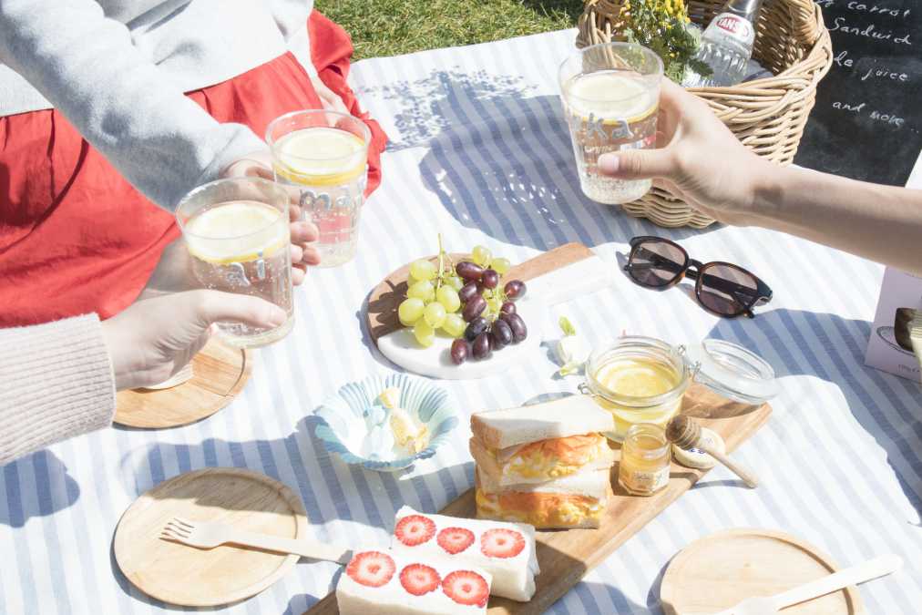 持ってきたものを広げるだけで、あっという間に準備完了。楽しいピクニックのはじまりです。乾杯の瞬間はぜひ写真におさめたい!