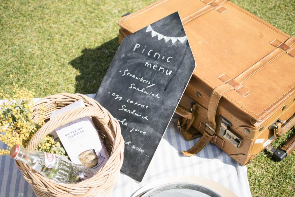 バスケットやクッション、小さな黒板や木の食器など、ピクニックを盛り上げるアイテムを持ち寄って、まずはシートの上に広げてみます。写真を撮りながら楽しく準備♪
