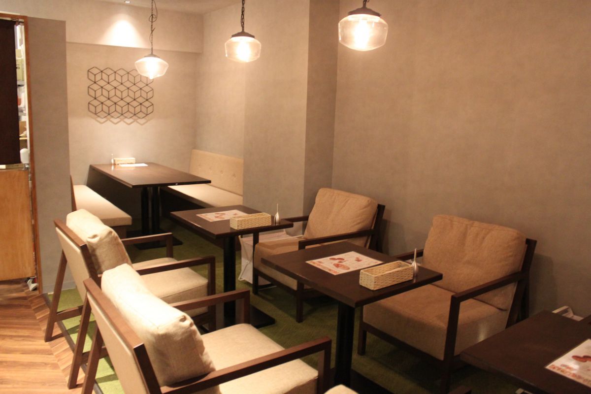 1階奥に広がるカフェスペース。落ち着いた照明とゆったりとしたソファが非日常のひとときを演出してくれます。「フルーツがしみじみおいしい!」とリピーター続出の人気店です。