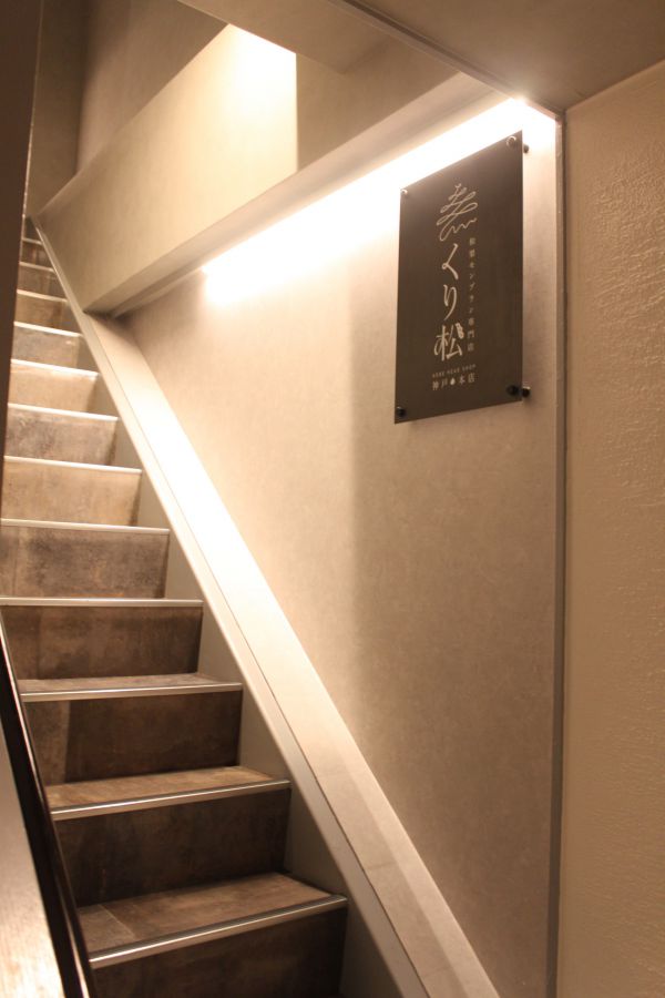 2階へと続く階段横にはシックな看板が。姉妹店の和栗モンブラン専門店「くり松」も「Mr.Fruits」 と同じ2021年1月23日にオープンしました。