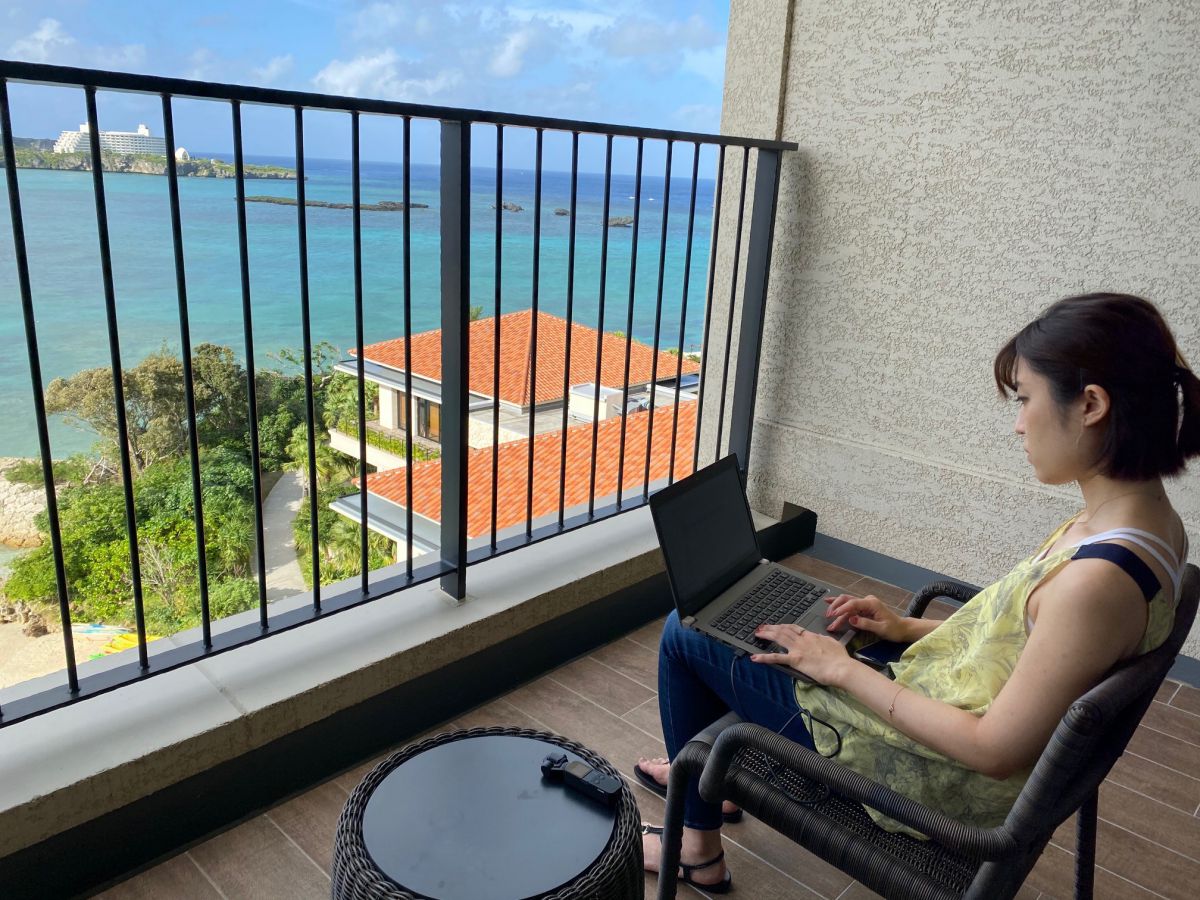 ワーケーション宿泊プランのあるホテル「シェラトン・グランデ・オーシャンリゾート」は、全室東向きのオーシャンビュー!Wi-Fiも備えられていて、リモートワークの環境はばっちり!安心して仕事ができます。窓から見える絶景をバックにオンライン会議に参加してみるのもおすすめ。