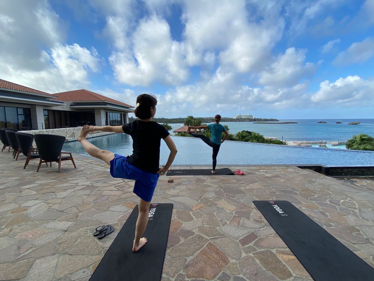 仕事の合間を縫って、ホテルの主催するアクティビティにも参加! マリンアクティビティ、フィットネス&ウェルネスアクティビティ、そして沖縄文化体験として伝統衣装を着せてもらっての三線教室などにも参加できますよ。