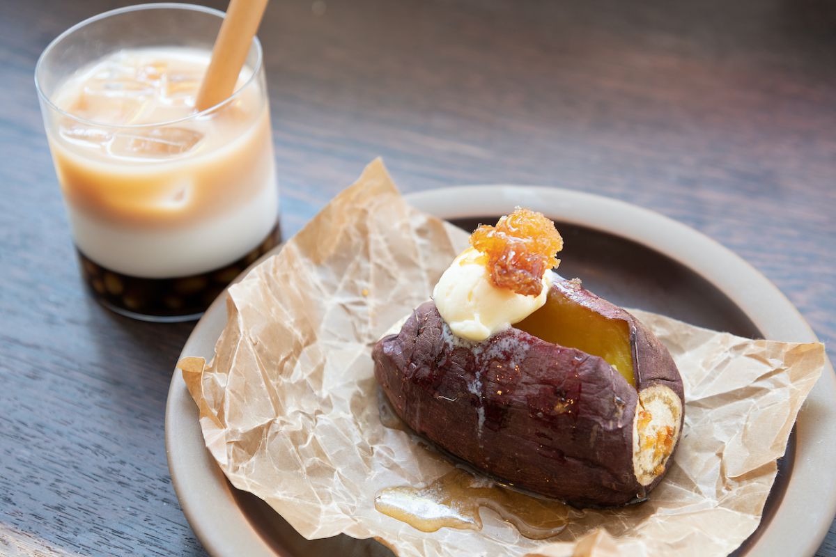 「浪漫焼き芋 芋の巣」では、ドリンクでも焼き芋が味わえます。シルクスイートの焼き芋に白玉粉を加えて、ひと粒ずつ成形した芋餅はモチモチ食感!アッサムの紅茶と黒糖シロップで作るミルクティーの中にたっぷり入っていて、噛むと芋の風味がしっかり!カロリーも低くリピーターも多いという、焼き芋ドリンクをぜひ味わってみてください。