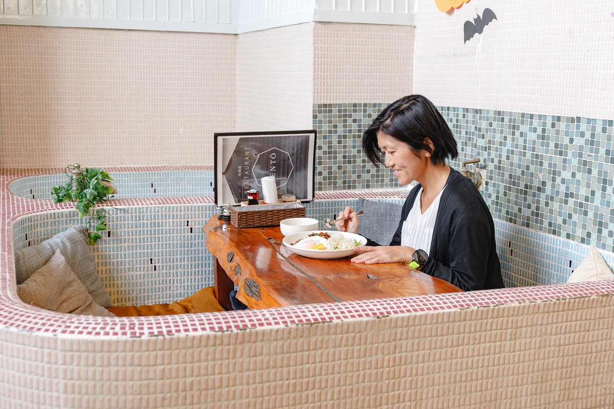 ゲストハウスの隣には、元銭湯をリノベーションしたカフェ「cafe & Lounge SENTŌ」があります。地場産のものを中心に、夕食の提供はありませんが、定食メニュー(平日11~15時のみ)や期間限定メニュー、スイーツ、さまざまなドリンクを提供しています。ちょっとしたお土産も、ここで購入可能。湯舟を利用した席に座って、普段とは違った雰囲気のなか、食事を楽しみましょう。