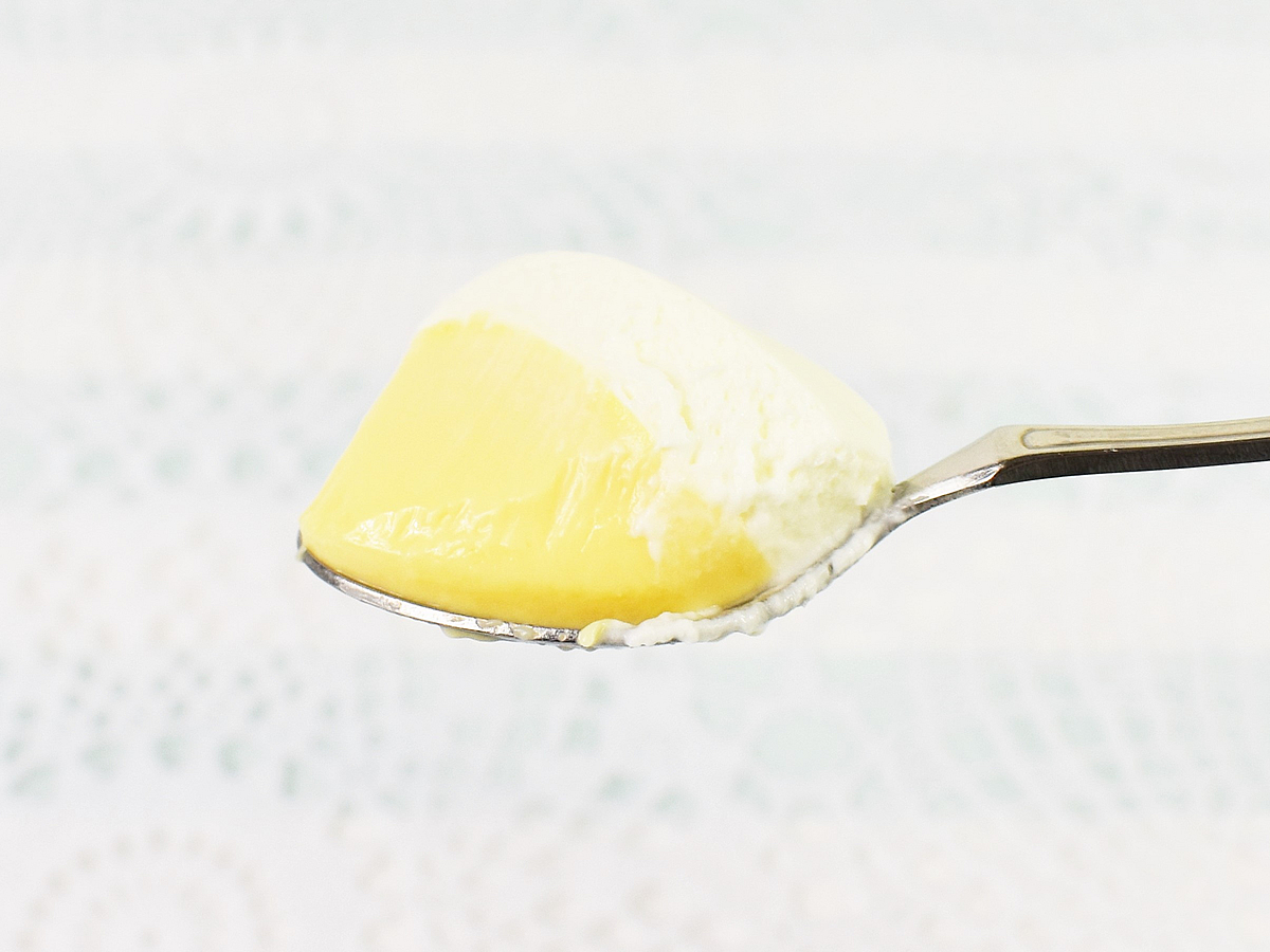フタを開けて真っ先に目に飛びこんできたのは、生クリームをブレンドした真っ白なクリーム。プリンに負けじと厚みがあって、しっかりと表面を覆っています。期待を膨らませながらいただいてみると、クリームの甘みとプリンのなめらかな食感に思わずにっこり。プリンからはクリームと異なった風味を感じられるため、食感だけでなく“2つの甘み”も楽しめました。