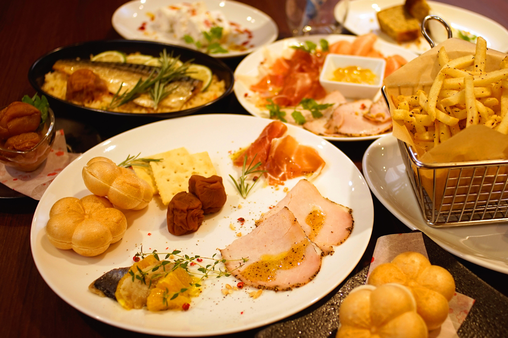 フードメニューには梅を使用したおつまみが並ぶ「オードブルスタンド」、梅の風味を効かせたきのこのキッシュやフライドポテトなどの「梅酒が進む温野菜」、バラエティに富んだ風味を楽しむデザート「プティフール盛り合わせ」のプレートが並びます。