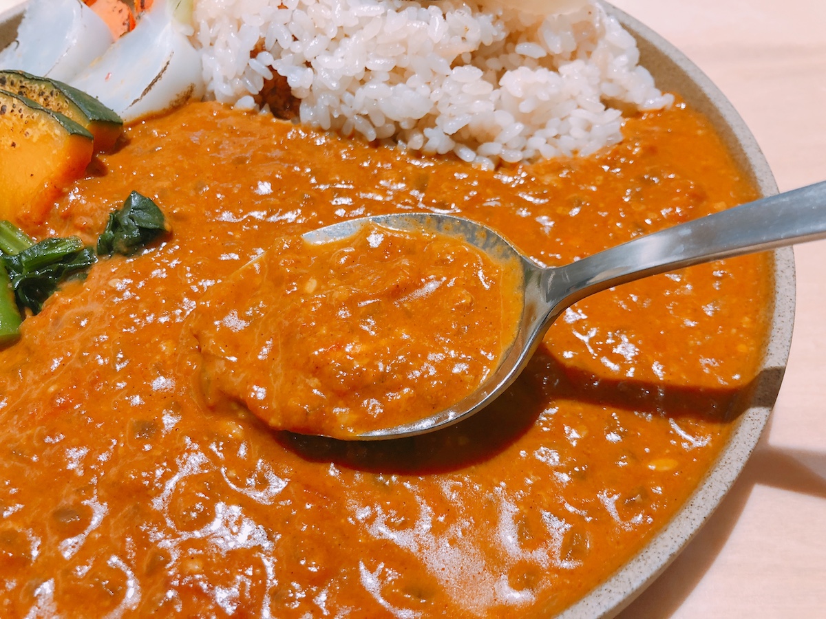 ルーは20種類のスパイスを使用し、有機玉ねぎをミックスしています。ひと口食べるとスパイスと玉ねぎの風味が口いっぱいに広がり、体がぽかぽか温まってきました。さらにココナッツの風味が爽やかな後味を残してくれます。