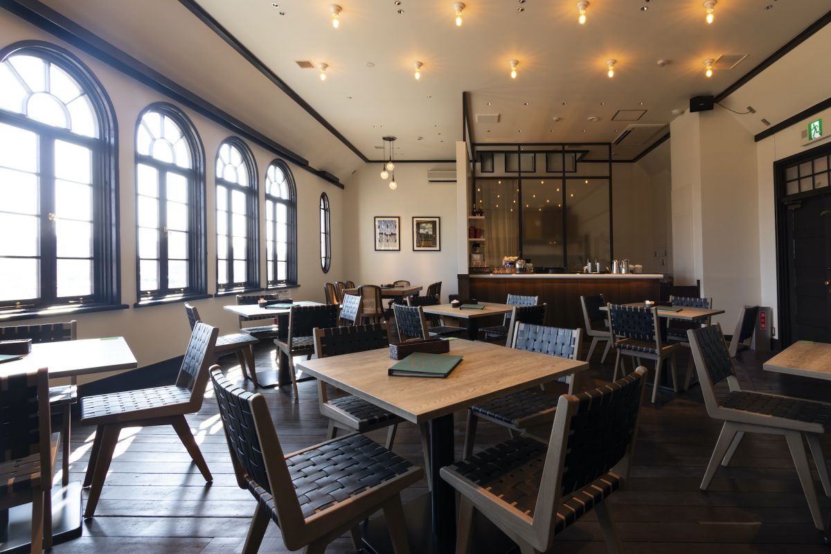 店内も、柱などをできるだけ生かして再生。天井が高く開放感のある1階には、約60のテーブル席とライブ感あふれるオープンキッチンが。季節限定で、テラス30席も登場予定です。