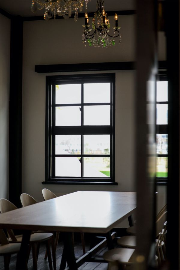 クラシックな階段を上り2階へ進むと、元大講義室を利用した空間が広がります。レトロな窓枠から光が降り注ぐ、どこか懐かしい雰囲気で、約46席が並びます。アンティークの大テーブルを配した半個室も。