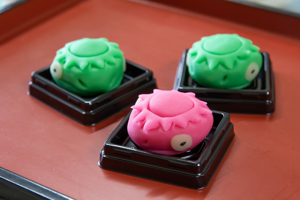 大正12年(1923)創業の老舗菓子舗「鶴乃屋菓子店」では、カッパの形の上生菓子練り切り作りが体験できます。見本のカッパはご覧の通り。気さくなご主人が楽しく話しながらあっという間に見本のカッパを仕上げていきます。ご主人の手元をお見逃しなく!