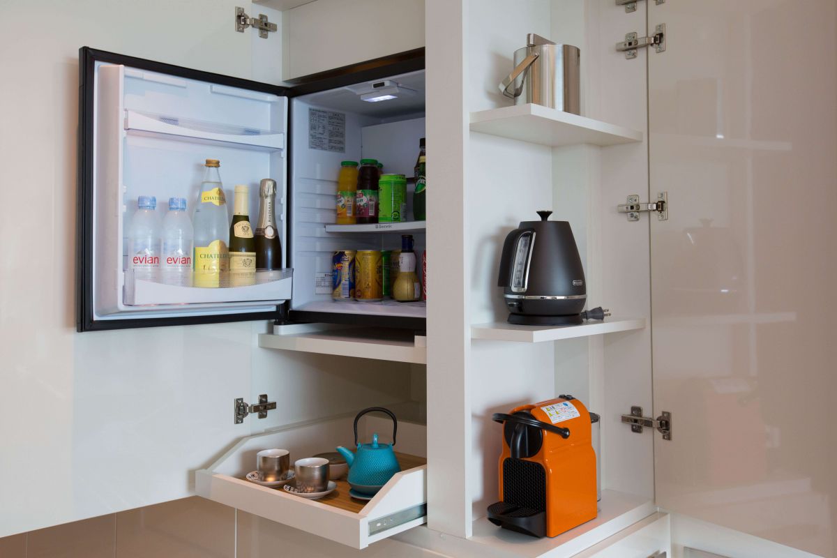 日本茶や紅茶、ネスプレッソコーヒーメーカーなどが無料で利用できるほか、冷蔵庫には、ミネラルウォーター、ビール、ソフトドリンク、ワイン、日本酒、ミニバー、スナック各種なども揃っています!(※冷蔵庫内、ミニバー、スナックは有料)