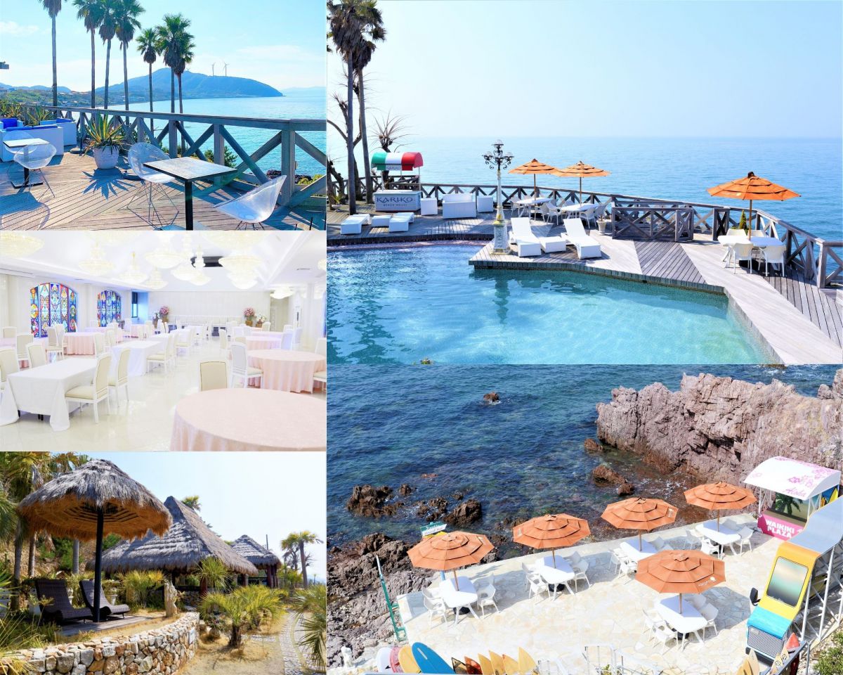 岬の最先端の高台に建つだけあって、ロケーションは最高。敷地内には、「一面に広がるオーシャンビュー」「心地よい潮風と波の音」「太陽の光でエメラルドに輝くプールサイド」「本格的なバリ島空間」「ステンドグラスとシャンデリアが輝く欧風空間」と5つの意趣を凝らした席が用意されているので、好きな場所を選んで。
