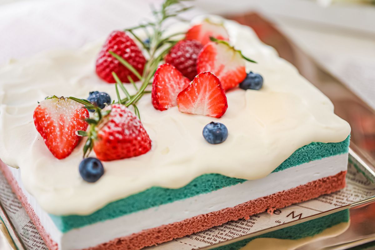 スケールの大きな大聖堂が目を引く結婚式場「心斎橋セントグレースヴィラ」。結婚式場のスイーツビュッフェということもあり、スイーツはどれも見た目も味もgood!なかでも目を引くのが、青・白・赤のトリコロールカラーのホールケーキ。かわいらしいルックスにおもわずひと目ぼれです。