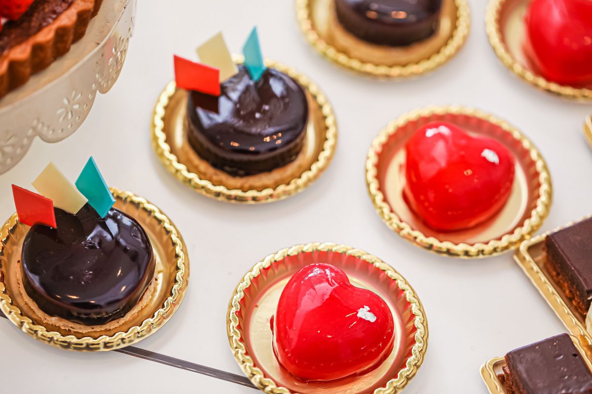 〈デザート〉トリコロールショートケーキ/パステルブルーマカロン/チョコレートロリポップ/カヌレ/マドレーヌ2 種(チョコ・プレーン)/カップケーキ/アイシングクッキー/クレームブリュレ/パリブレスト/パリスジュレ(苺・ブルー)/コーヒーゼリー/クレームダンジュ/シャルロットフリュイ/ ハートムース/タルト・オ・フレーズ/フロマージュムース/オリジナルモンブラン/焼きチョコ/ストロベリーシフォンケーキ/エンゼルフードケーキ/ムースショコラ