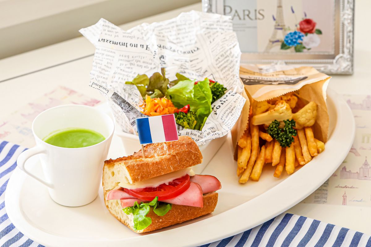 〈ワンプレート〉トマトとモッツァレラチーズのバゲットサンド/翡翠豆のポタージュ/ポテトとカリフラワーのフリット/サラダ キャロットラペ ブロッコリーマリネ