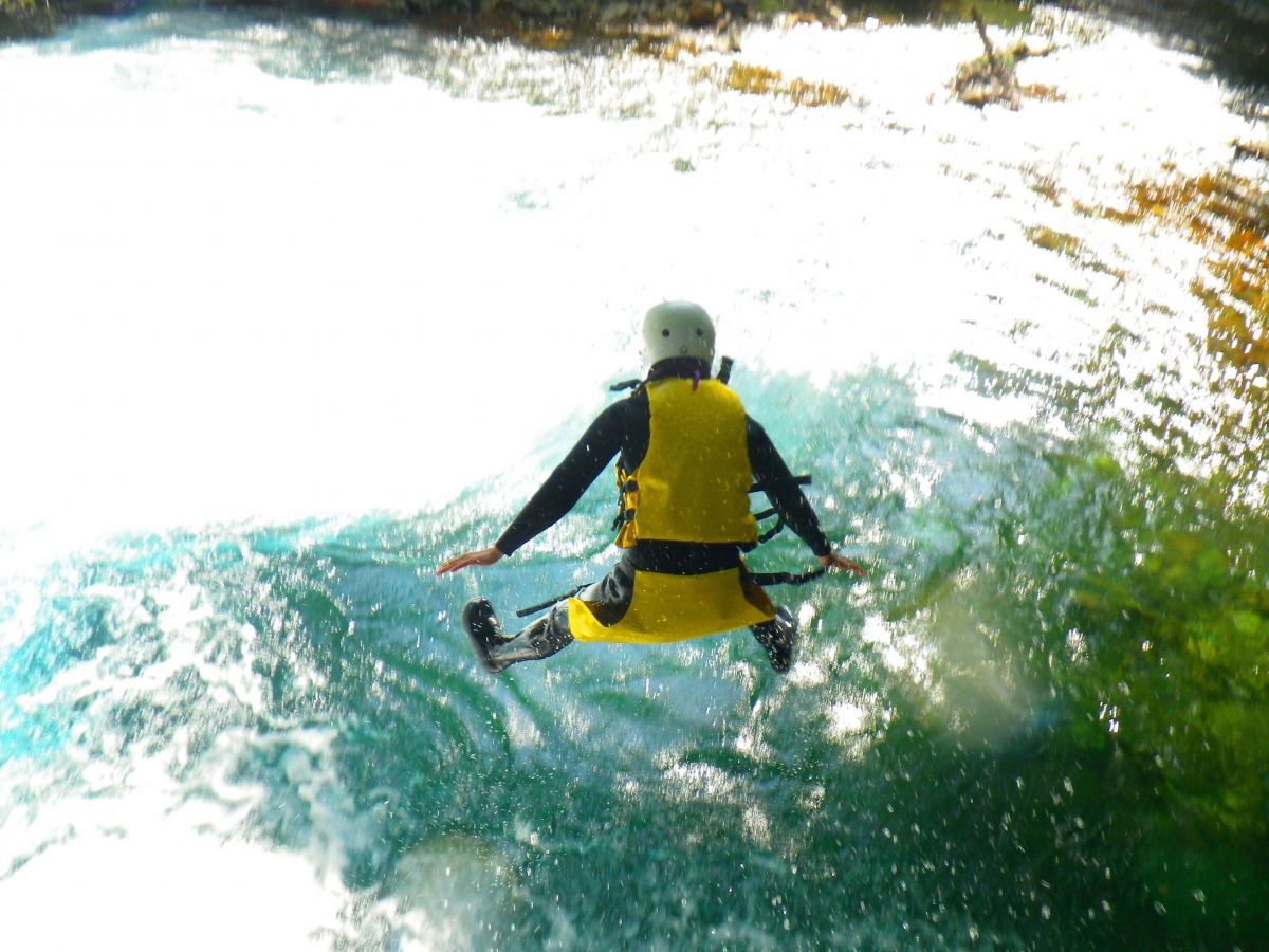 水しぶきを豪快に浴びる天然のスライダーをいくつか体験した後のお楽しみは、約5mの高さからのジャンプロック!天然の飛び込み台から下を見ると、水の透明度が高すぎて底まで見えるほどです。青く美しい水に勇気をもってジャンプすると、気分は爽快!