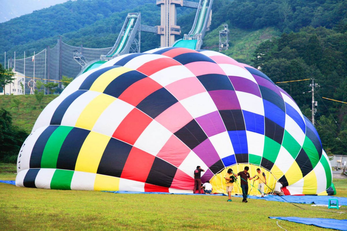 気球に乗るのは、1998年冬季オリンピックの会場となった「白馬ジャンプ競技場」の横。ゴーッという音と共に、巨大なバーナーから熱風を送り込んで気球を膨らませます。