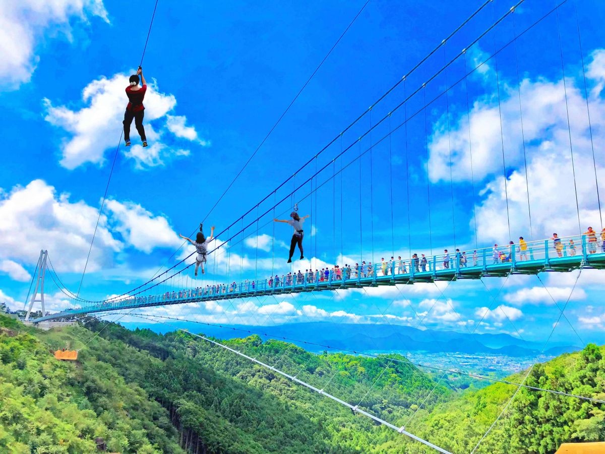 地上から約70mの高さでのジップスライドは、風を切る音が心地よく、まるで自分が鳥になったような爽快感を味わえます!吊り橋の上から手を振る方の姿が見えたりもしますよ♪