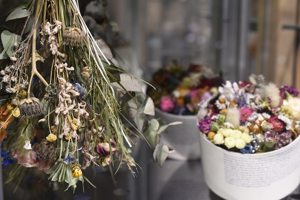「ew.note」では、“花を棄てず、次に繋げる”というテーマを掲げていて、元気がなくなってしまった花はすべてドライフラワーに生まれ変わり、再び店頭に並びます。